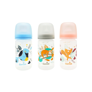 Biberón Genial de 9 onzas cuello ancho con tapa de colores y variedad de diseños (6m+)