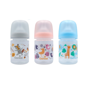 Biberón Genial de 4 onzas cuello ancho con tapa de colores y variedad de diseños (0m+)