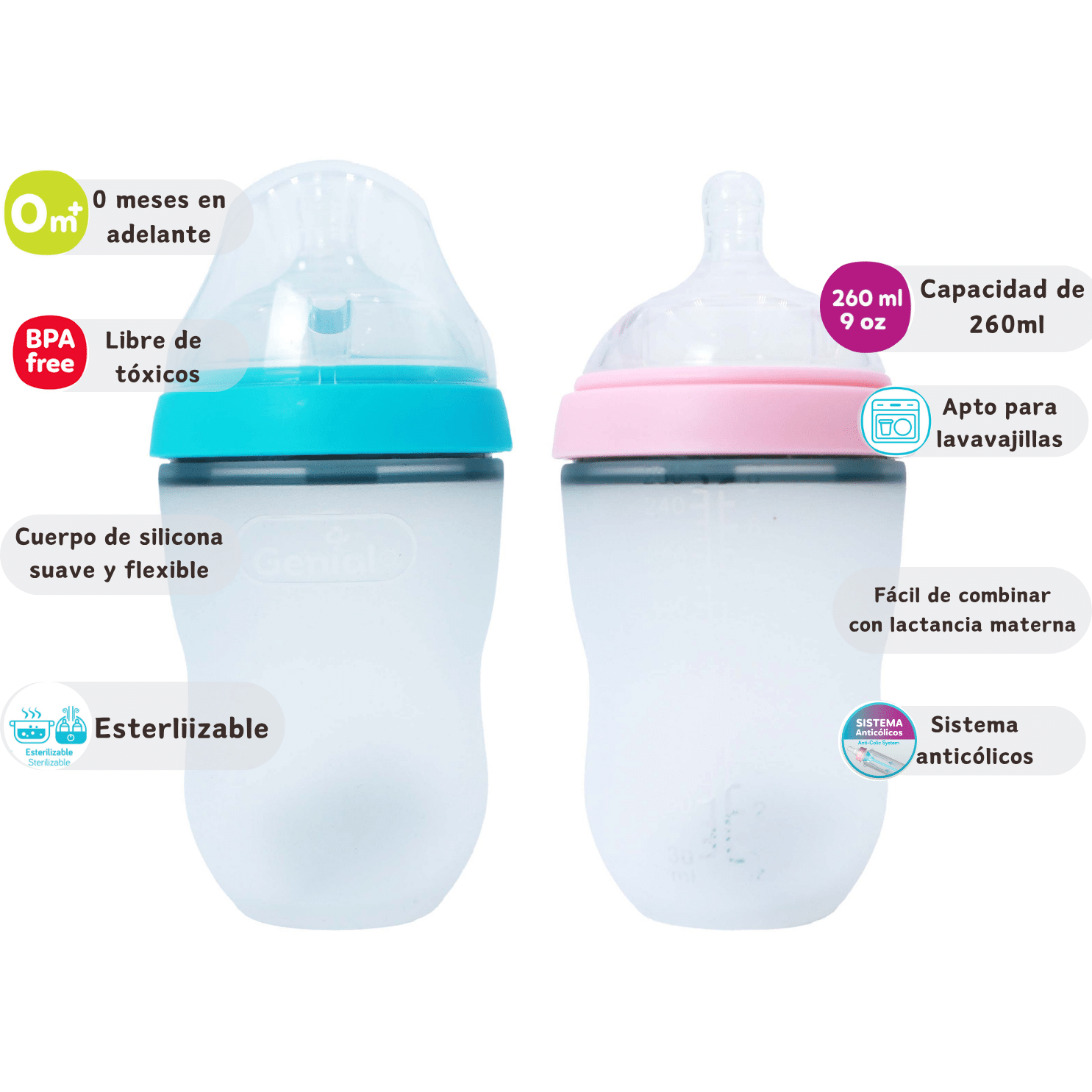 Libre de tóxicos, dos diseños disponibles, tetina de silicona, suave, capacidad de 9oz