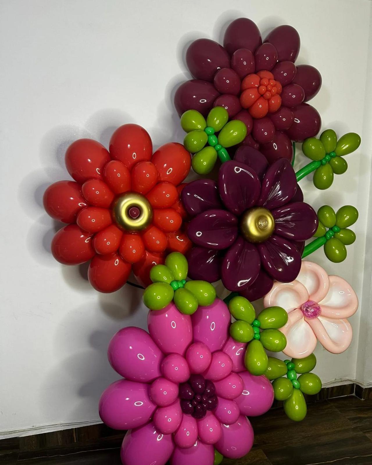 Con una altura de 2 metros, esta decoración combina flores en tonos morado, rojo, vino, verde y rosado, creando una composición llena de color y elegancia. Los pétalos en los laterales aportan dinamismo y un efecto visual único que realza cualquier espacio.