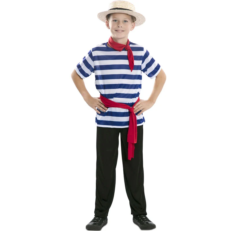 El simpático disfraz imitando un Gondolero en Venecia para niños incluye: Camiseta, pantalón, pañuelo, cinturón | Este traje gondolero veneciano niño está disponible en 4 tallas distintas