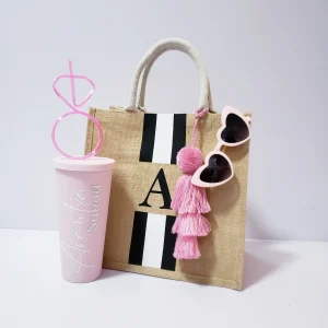 Paquete con bolsa de playa con listón y sombrero de playa ambos personalizados.