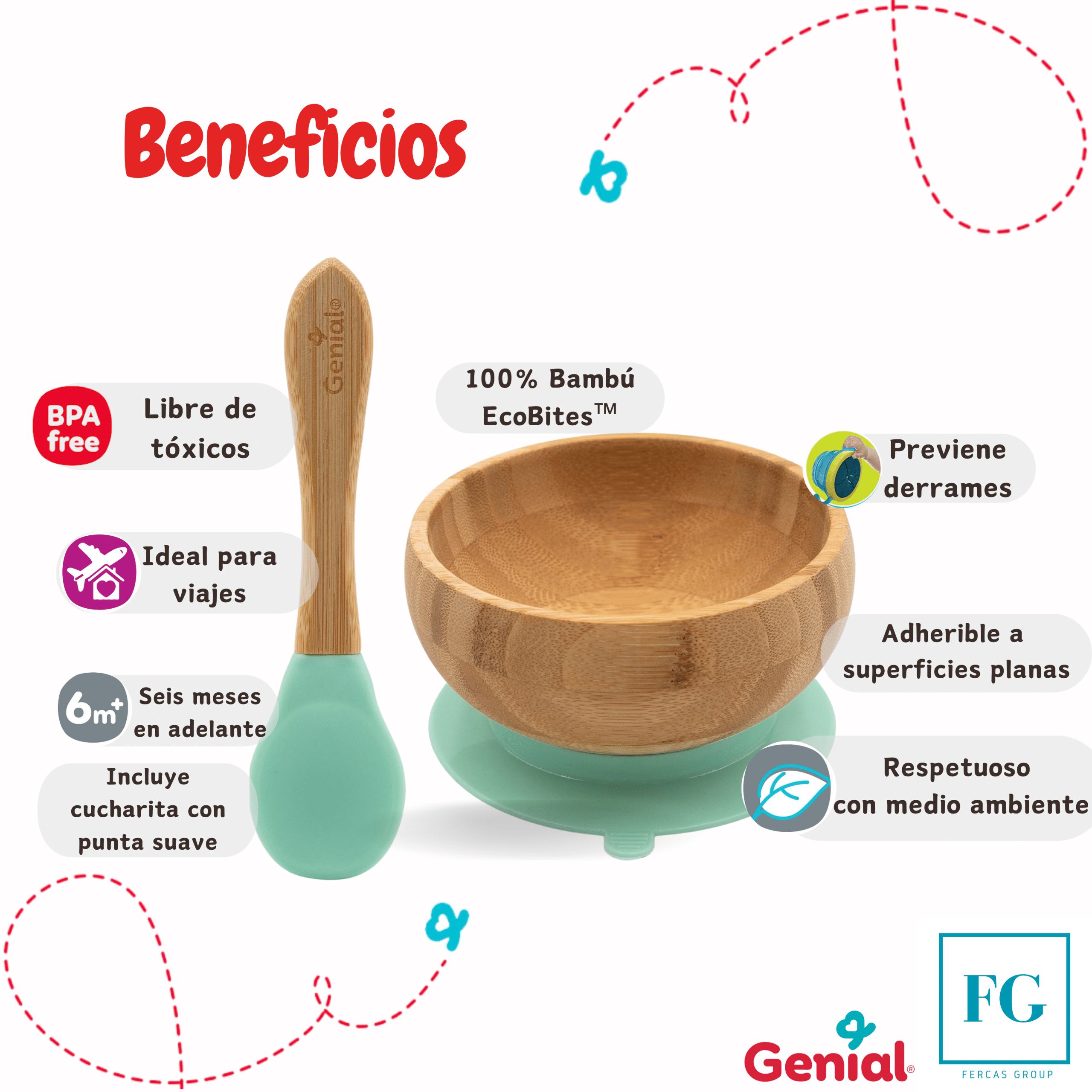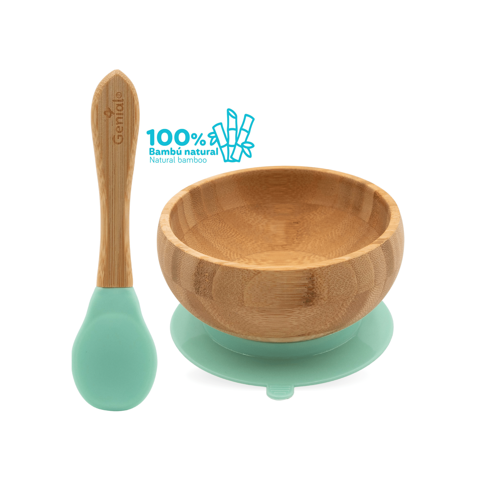 100% de bambú EcoBitesTM, libre de tóxicos, ideal para viajes, incluye cucharita con punta suave, previene derrames, adherible a superficies planas, respetuoso con el medio ambiente